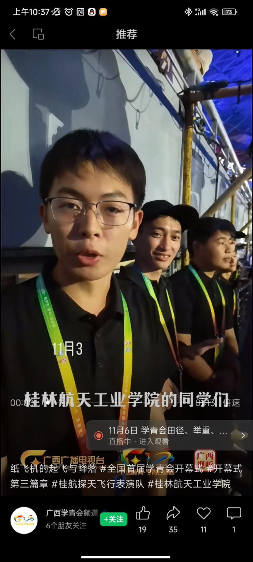 近日,m88明昇2021级无人机应用技术专业学生黎昊参加全国第一届学青会开幕式的演出,他与自己的队员用精湛的操控技术完美诠释了文体展演第三篇章《青春的奔跑》,在接受广西电视台采访时,他说:“我们是桂林航天工业学院的学生,飞机都是我们自己亲手制作的,因为是在夜间飞行,还是比较有挑战性的,但是我们会加油的。”