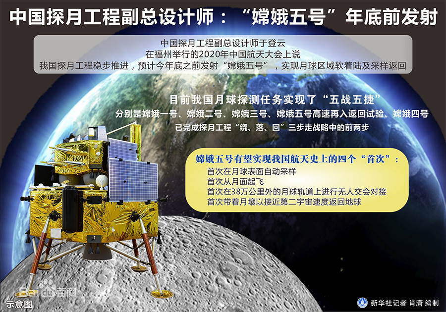 2020年11月24日,长征五号遥五运载火箭搭载嫦娥五号探测器成功发射升空并将其送入预定轨道。11月24日,嫦娥五号完成第一次轨道修正。11月25日,嫦娥五号完成第二次轨道修正。11月28日,嫦娥五号进入环月轨道飞行。11月29日,嫦娥五号从椭圆环月轨道变为近圆形环月轨道。11月30日,嫦娥五号合体分离。12月1日,嫦娥五号在月球正面预选着陆区着陆。12月2日,嫦娥五号着陆器和上升器组合体完成了月球钻取采样及封装。12月2日,嫦娥五号完成月面自动采样封装。12月3日,嫦娥五号上升器将携带样品的上升器送入到预定环月轨道。12月6日,嫦娥五号上升器与轨道器和返回器组合体交会对接,并将样品容器转移至返回器中。12月6日12时35分,嫦娥五号轨道器和返回器组合体与上升器分离,进入环月等待阶段,准备择机返回地球。12月8日,嫦娥五号上升器受控离轨降落在预定落点。12月12日,嫦娥五号轨道器和返回器组合体实施第一次月地转移入射。12月16日,嫦娥五号探测器顺利完成第二次月地转移轨道修正。12月17日凌晨,嫦娥五号返回器携带月球样品着陆地球。