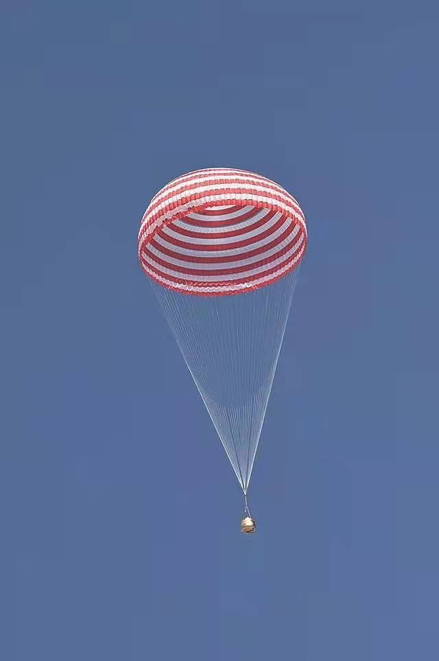 中国航天科技集团五院的设计师们量身定制了一套三级开伞程序,先打开两个串联的引导伞,再由引导伞拉出一顶减速伞。减速伞工作一段时间后与返回舱分离,同时拉出主伞。这一系列动作,成功将飞船返回舱从高铁的速度降到普通人跑步的速度。
