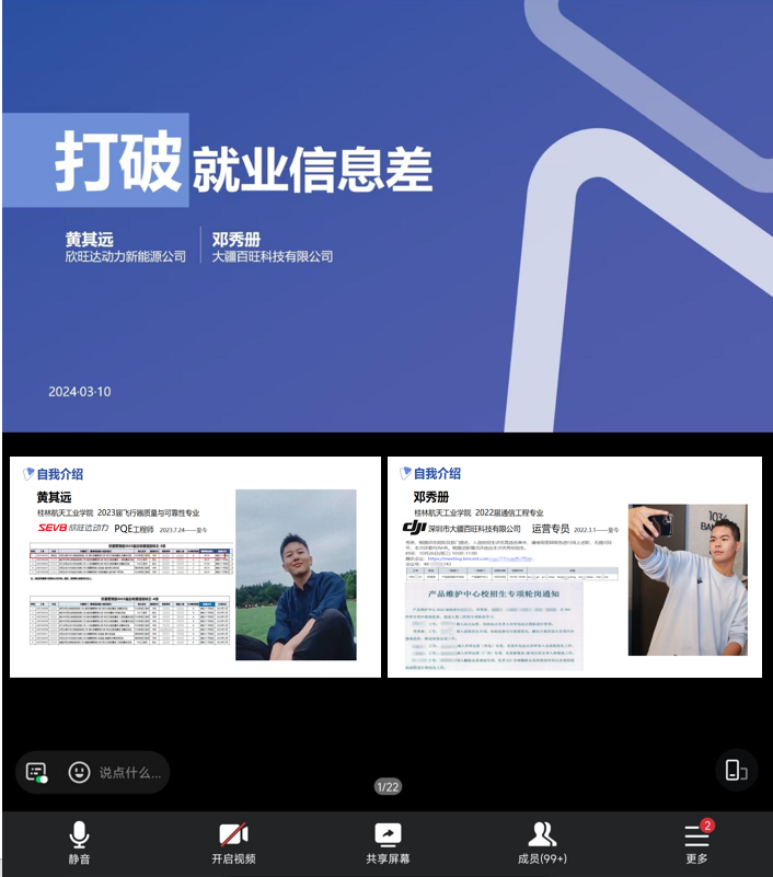 会上,黄其远、邓秀册2位学长就围绕求职信息获取、就业行业选择、择业岗位分析、就业信息差的获取、简历制作、面试技巧等方面展开分享,并结合自身的学习、工作、岗位经历与参会的毕业生们进行交流,就同学们提出的问题进行注意解答和引导。他们鼓励2024届毕业生明确目标、敢于尝试、敢于担当、敢于奉献。