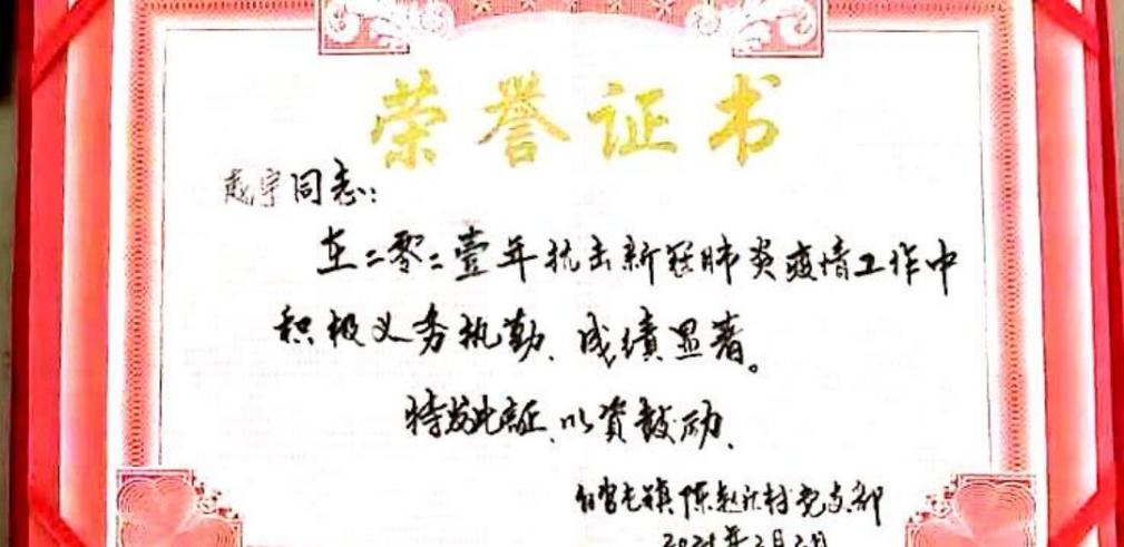 在日常防疫工作,他严格遵照疫情防控部门的要求,稳中求细,不留死角。在北方零下十几度的严寒下,为了弄清人员居住情况,做好消毒防护措施,赵宇同其他志愿者们逐一入户摸排弄清各村户居住情况,不厌其烦的反复提醒防控要求。在卡点站岗执勤中,严格把控,认真做好人员出入登记工作,量体温、去向登记、证明索取、车辆消毒、鞋底消毒等等,每一项工作都井然有序,不漏项、不马虎。他说:“虽然每天至少十二个小时的防疫任务,条件和过程都比较艰苦,但是想到自己能为国家的防疫事业贡献出自己的一份力,再辛苦也是值得的。”赵宇同学利用寒暑假时间连续三年在所在村担任防疫志愿服务者工作,服务时长总计超过300小时,连续三年被授予抗击新冠肺炎疫情工作荣誉证书。
